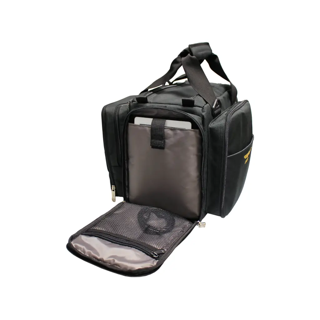 O compartimento principal é personalizável com divisórias, permitindo aos pilotos organizar os itens de acordo com a preferência pessoal. Na frente, um bolso de acesso rápido com fecho de correr bidirecional proporciona armazenamento conveniente, enquanto um compartimento grande adicional acomoda cartas, planos de voo ou outros documentos importantes. No interior, múltiplos compartimentos, um suporte para canetas e um suporte para baterias mantêm itens mais pequenos organizados e ao alcance.